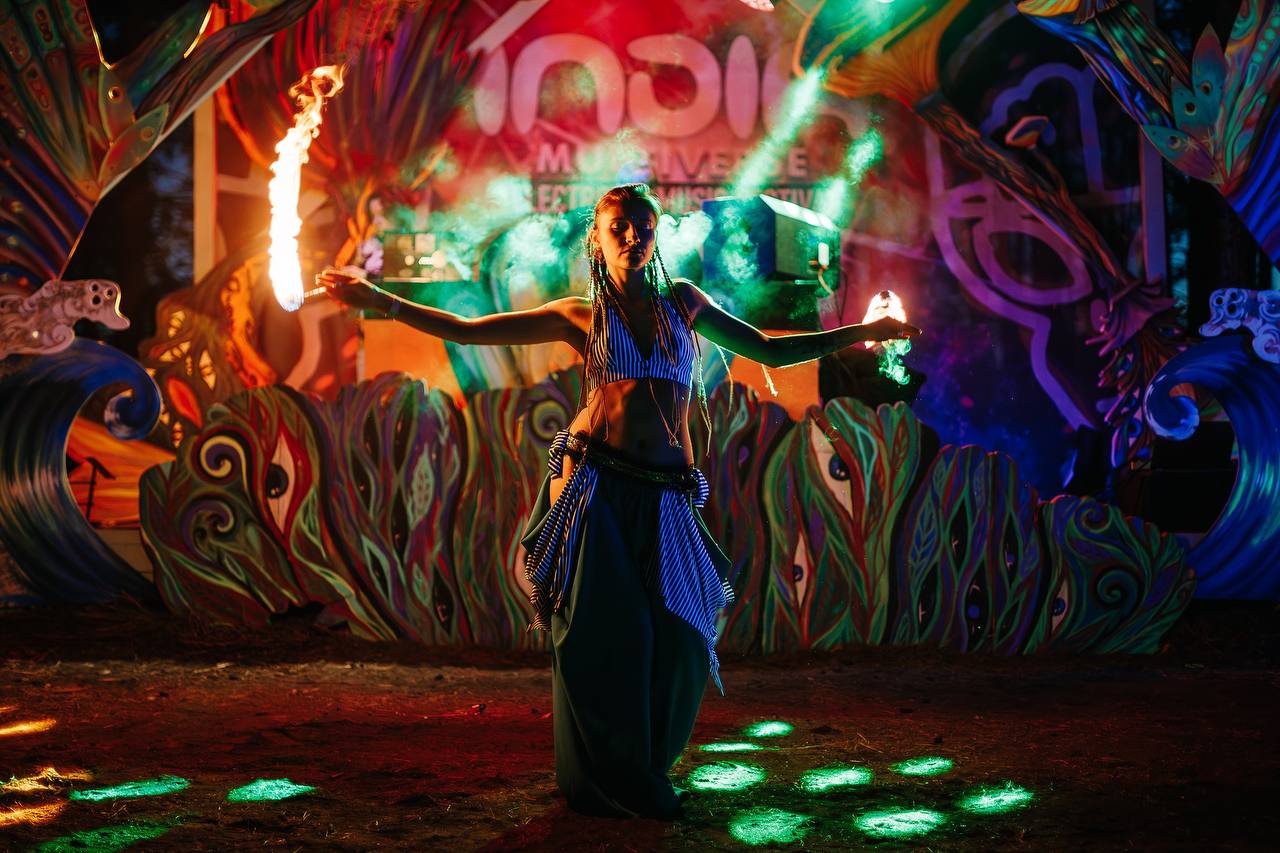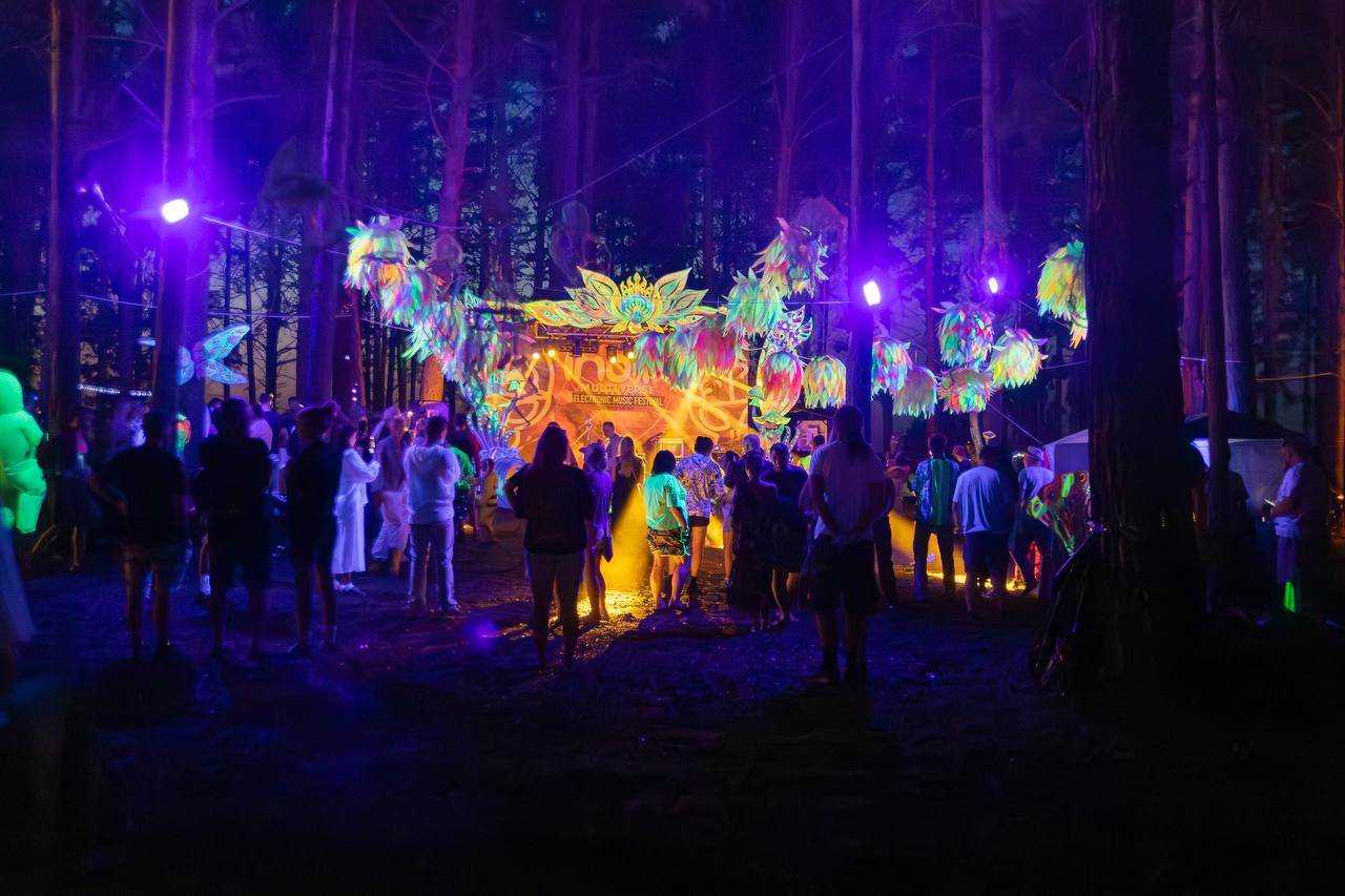 Ночью – вы погружаетесь в атмосферу таинственного леса, где флюрные объекты начинают светится и улицы и аллеи заливаются неоновым светом. А на сценах начинается грандиозное представление, лазерное и световое шоу с лучшими музыкантами и ди-джеями со всей России.