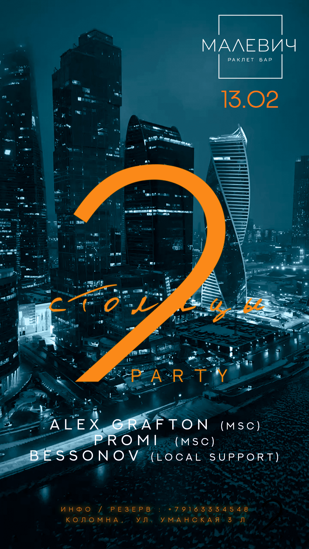 Отличные новости на этот понедельник: 13 февраля мы отправляемся в город Коломна на вечеринку в Малевиче с шоукейсом «2 столицы»! 🌆