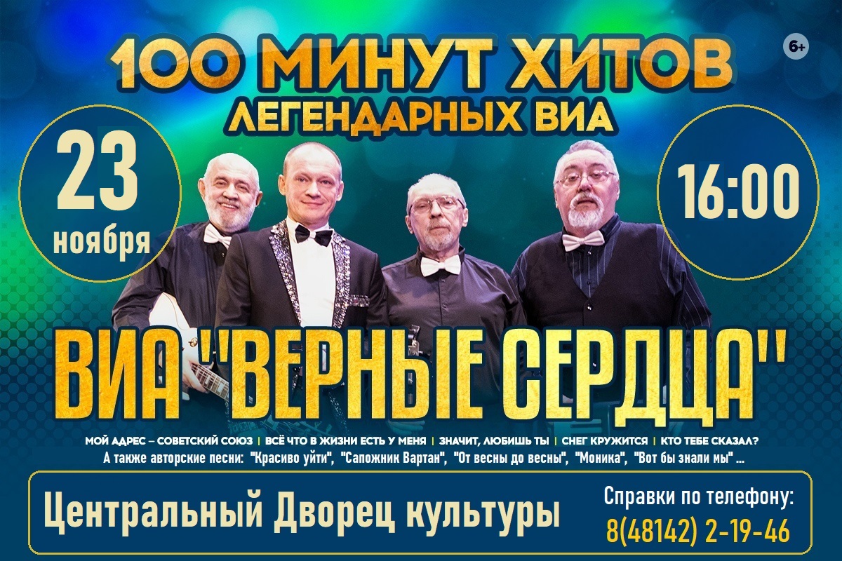 Программа «100 минут хитов легендарных ВИА» - это живой звук, красивый свет, интересный видеоряд и энергетика вечно молодых хитов 70-х: «Мой адрес - Советский Союз», «Снег кружится», «Кто тебе сказал», «Не надо печалиться», «Из вагантов», «Прощай», «Там, где клен шумит», «Не повторяется такое никогда», «Надежда», «Последняя электричка» и многих других.