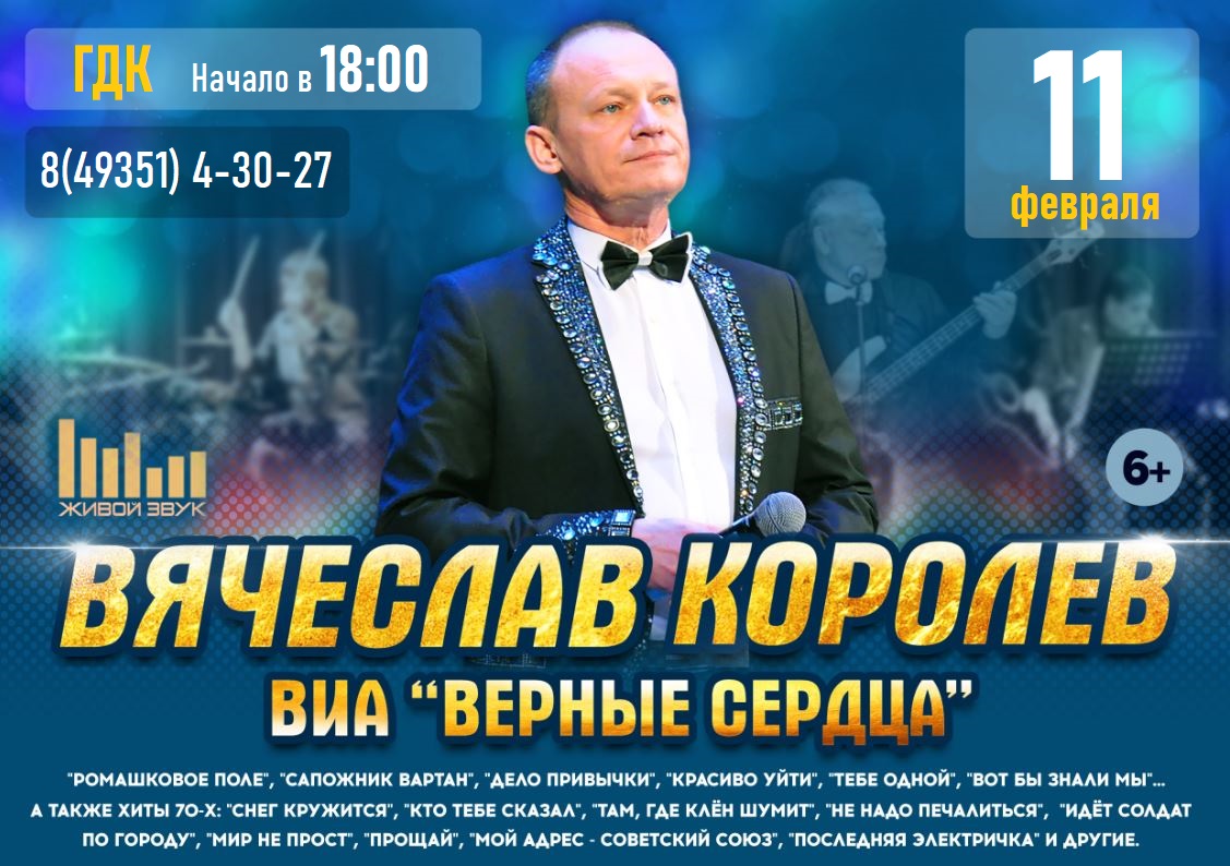 Основатель и солист ВИА «Верные сердца» Вячеслав Королев вместе с музыкантами представят в своей программе не только отборные хиты 70-х, но и лучшие авторские песни, которым публика кричала «Браво!» на многочисленных концертах коллектива: «Ромашковое поле», «Тебе одной», «Дело привычки», «Красиво уйти», «Сапожник Вартан», «Вот бы знали мы», «Танцуй со мной», которые вы можете послушать на Яндекс.Музыке по ссылке: или в официальном сообществе коллектива «ВКонтакте» по ссылке: